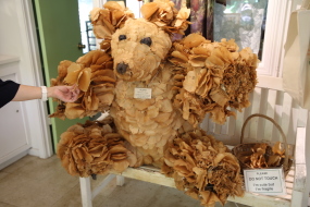 (画像1)は(画像2)の葉っぱから作られたそうである。スーベニアショップの中に飾られている。ここのスーベニアショップではフレンチブルの「あずきビーンズ」が接待をしてくれる。