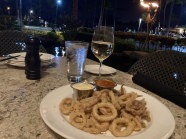 日没時間帯に予約を取ると夕日を鑑賞しながら食事ができる。フォーシーズンズのレストランNoeからは生け垣を超えていかないと夕日は見えなかった。アペタイザーのイカはとても柔らかくこれ一品で十分お酒が飲める。日本人好みの味付けであった。今回のハワイ旅行の最後の晩餐でした!