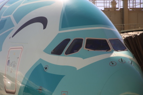 JAL機尾翼の向こうにフライングホヌの機体が見えた。少し、浮気してフライングホヌに接近してみた。かわいい表情である。コックピットに手を振ってはみたが、振り返してはいただけなかった!??