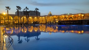 | ホテルのライトアップによって浮かび上がったエジプト風な風景が?ホテル内もいろんな趣向を凝らして私たちを迎えてくれている。 |