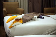コンチェルト号に帰り船内昼食。部屋に帰るとワニが横たわっている。清掃後わざわざ枕や足カバーなどを利用したサプライズだった。妻は早速呼び止めトトロのお返し。友達と一緒に作ったというのでその友達にもと・・・。明日はもっとすごいのを作ってくれるという!楽しみが増えた。